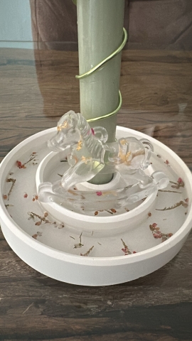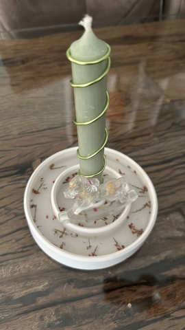 Runder Kerzenständer mit klarem Harz mit eingelassenen Trockenblumen, Kerze und Schaukelpferdchen