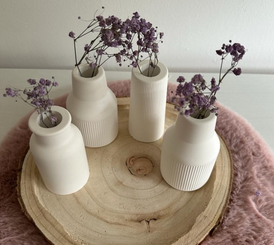 Besteht aus 4 kleinen Vasen (ohne Trockenblumen / Holzscheibe).