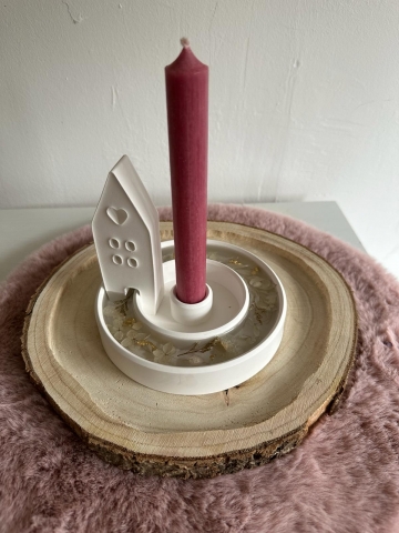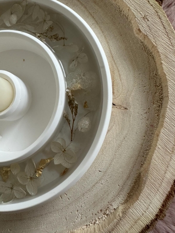Runder Kerzenhalter mit Harz ausgegossen und eingelassenen Trockenblumen. Eingearbeitetes kleines Haus.