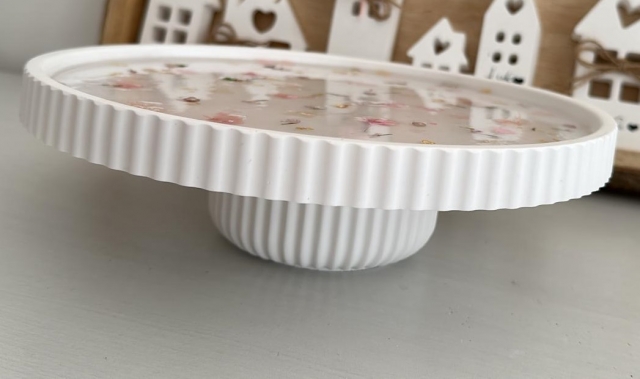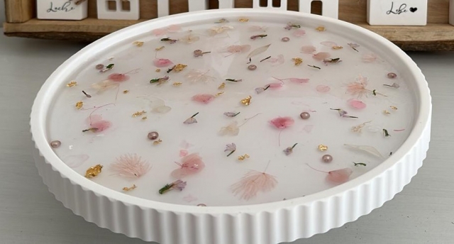 Schöne Kuchenplatte mit Harz und eingelassenen Trockenblumen