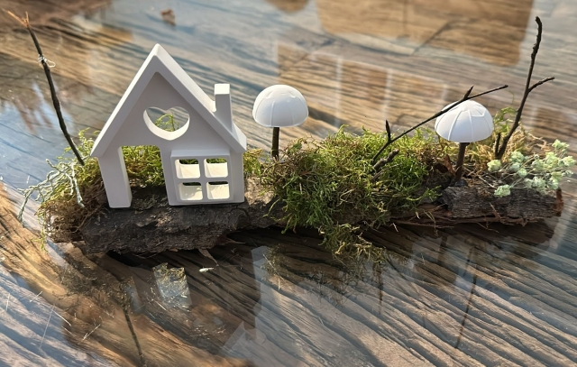 Holzscheit mit Moos, 2 Deko-Pilzen und kleines Deko-Haus.